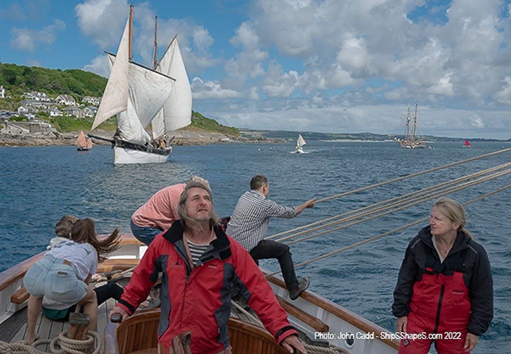 The Pilot Cutter MASCOTTE crosses the finish to win in the Mousehole Sea Salts & Sail 2022 festival, with Skipper Adam Spargo at the helm.
